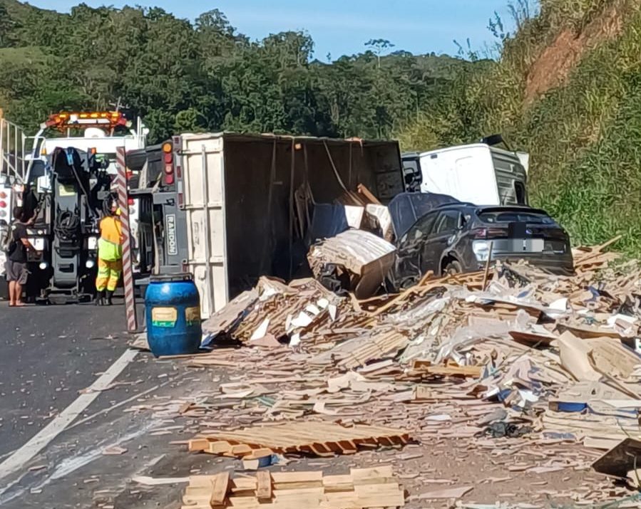 Com o impacto, parte da própria carga de pisos do caminhão se desprendeu e atingiu um carro que trafegava pela pista no momento do acidente. Ainda não há informações confirmadas sobre vítimas.
