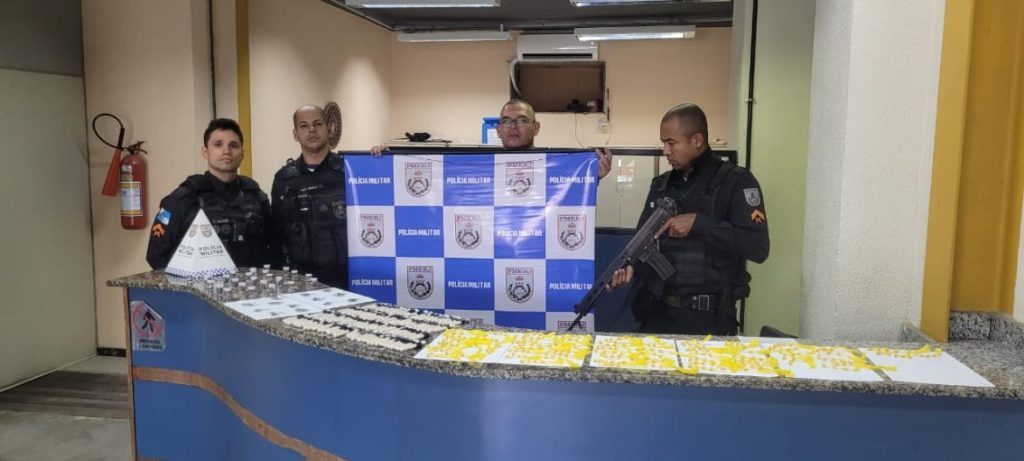 Após a tentativa de abordagem, os policiais receberam informações indicando que traficantes teriam escondido entorpecentes na região. Com o apoio do Patamo 2, os agentes realizaram buscas em uma área de difícil acesso, onde localizaram: 26 baldinhos de maconha (26g), 13 sacolés de maconha, 129 “canetões” de cocaína (258g), 295 pedras de crack (295g)