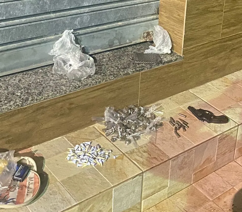 Quando desceram, eles tentaram fugir e se desfazer de duas sacolas, mas foram alcançados pelos agentes. Dentro das bolsas foram encontrados um revólver, 16 munições, cerca de 557 trouxinhas de maconha, 70 cápsulas de cocaína, um celular e uma carteira com dois cartões de débito.