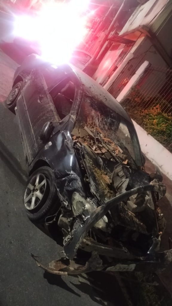 A perseguição terminou na Rua São Pedro, onde o condutor perdeu o controle da direção e colidiu contra o muro de uma residência. Após o impacto, o suspeito abandonou o veículo e fugiu a pé, pulando muros de casas próximas. Apesar de não ter sido localizado, a PM encontrou dentro do carro documentos e um telefone celular que seriam do autor.